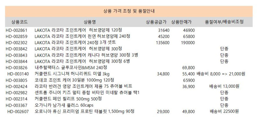 품절상품 및 가격조정상품 안내를 드립니다.