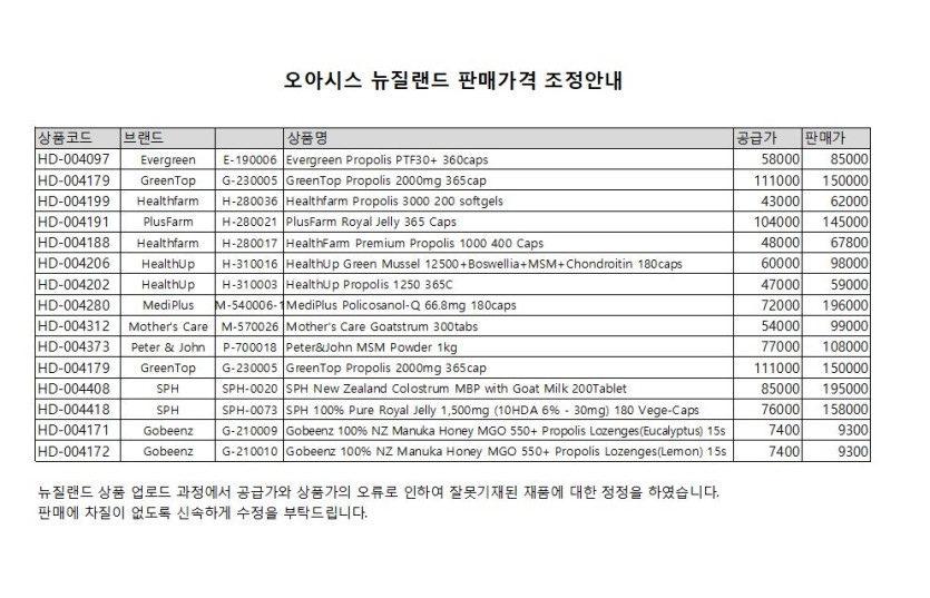 긴급공지 뉴질랜드 상품가격 오류 정정요청